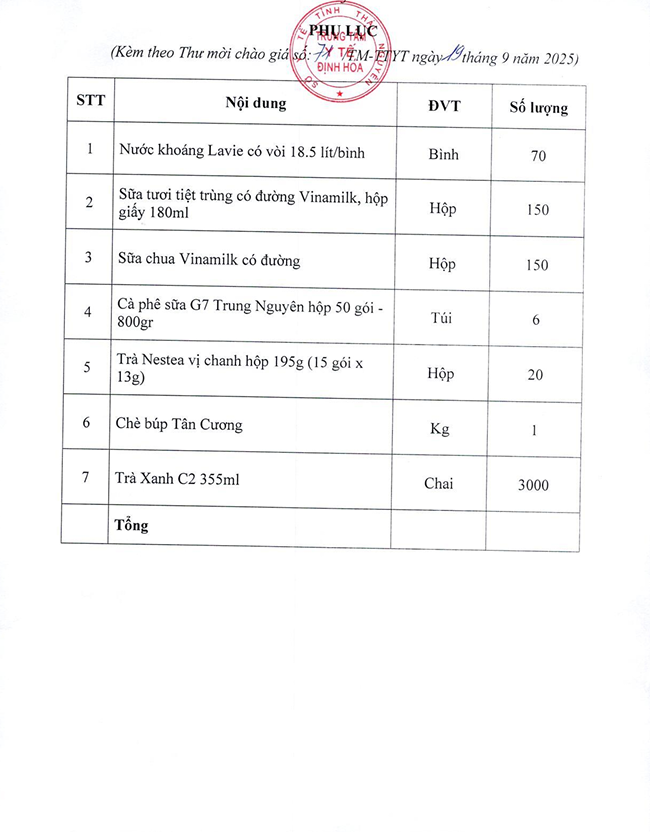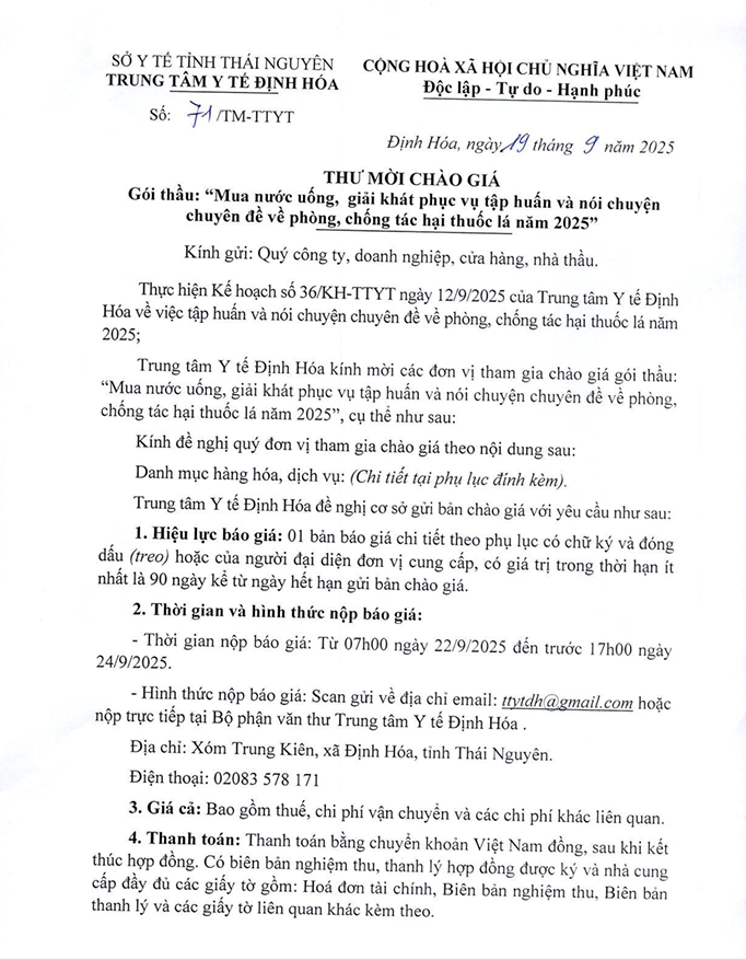Thư mời chào giá Gói thầu: “Mua nước uống, giải khát phục vụ tập huấn và nói chuyện chuyên đề về phòng, chống tác hại thuốc lá năm 2025”